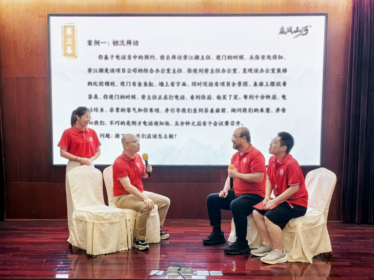在培训阶段,学员们通过专题讲座、案例分享、现场教学、情景演练、高管面对面等授课方式,围绕团队共创、政企大客户与商务谈判、企业经营及市场营销沙盘演练、创新设计与服务体系搭建等模块展开深入学习,分组开展案例教学,运用营销工具进行案例分析,模拟实操演练,探讨实际销售过程中遇到的痛点和难点的解决方案。学员还对公司产品规划手册及各类业务的开展进行详细了解和探讨交流,结合公司具体业务及产品内容展开营销方面的学习。在培训的“高光时刻”,优秀销售代表向大家传授并分享了销售经验,帮助参培学员学习经验技巧,并将其运用到实际销售工作当中。在“高管面对面”环节,何晨光与学员们展开面对面交流,参培学员借此机会提出所关心的问题,了解华南区域改革方针、经营战略及发展方向等。